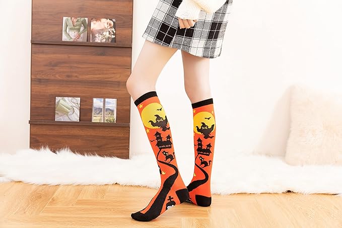Bulk pack of 12 pairs Women’s Halloween knee-high socks (size 9–11) featuring spooky and fun designs: pumpkins, ghosts, witches, black cats, candy corn, skeletons, and haunted houses. Soft, stretchy, tall socks perfect for boutiques, gift shops, seasonal retail, Halloween parties, trick-or-treating, fundraisers, classroom gifts, and resale. Fits most women’s shoe size 5–10.
